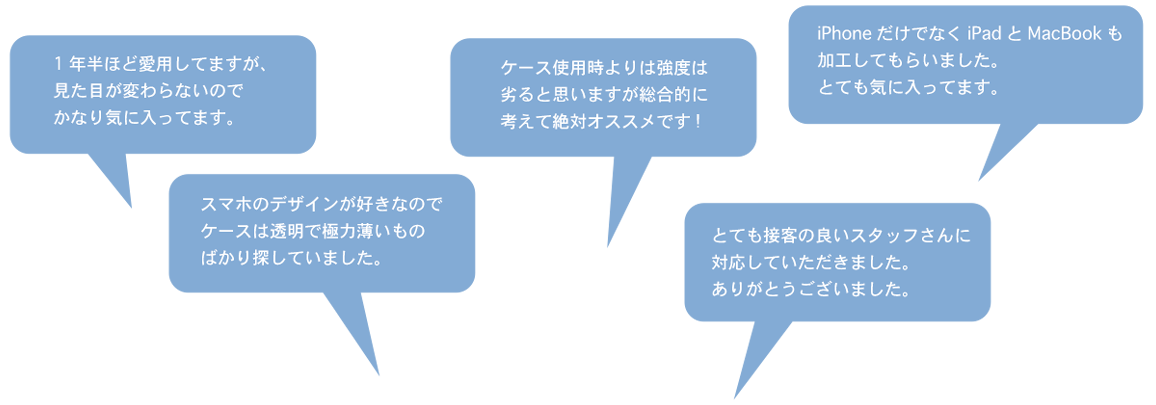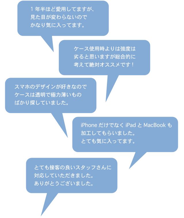 - A : 端末や加工の種類にもよりますが、全面フル加工で30分程度、ディスプレイ面加工の みであれば5分程度で仕上がります。